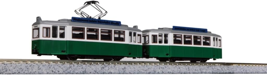This is a 1:150 scale N-gauge model tram designed by Kato, part of their My Tram Classic series. It’s styled as a retro-inspired streetcar with a classic green and white livery, suitable for adding character to your N-scale model railway or tram layout.